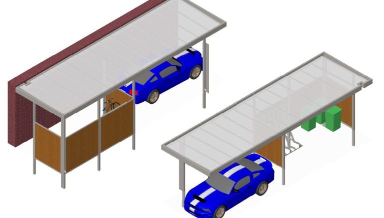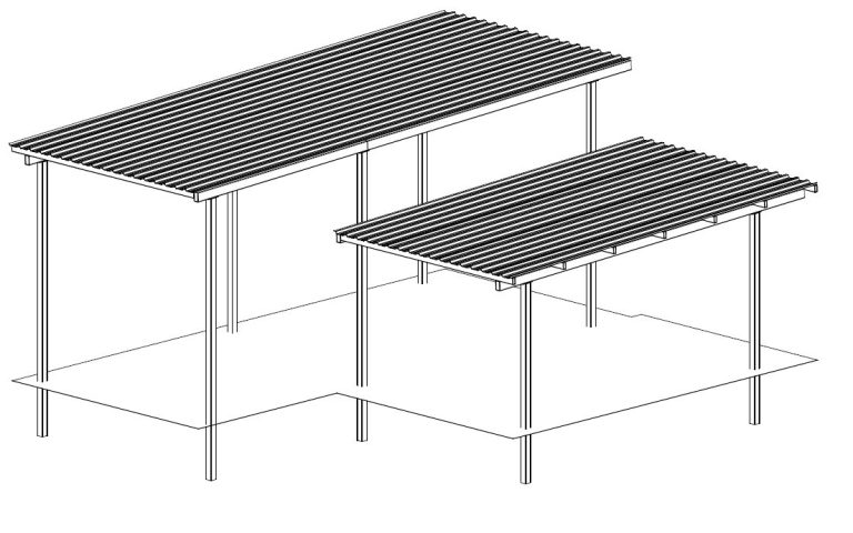 Um sowohl für einen PKW als auch ein hohes Allrad Wohnmobil einen geschützten Stellplatz zu bekommen, wurde diese Kombination aus zwei Carports geplant.