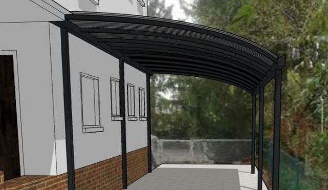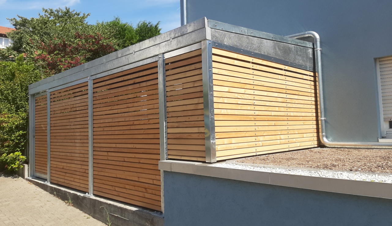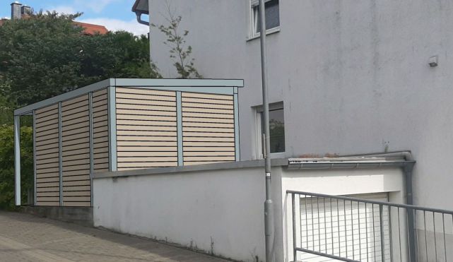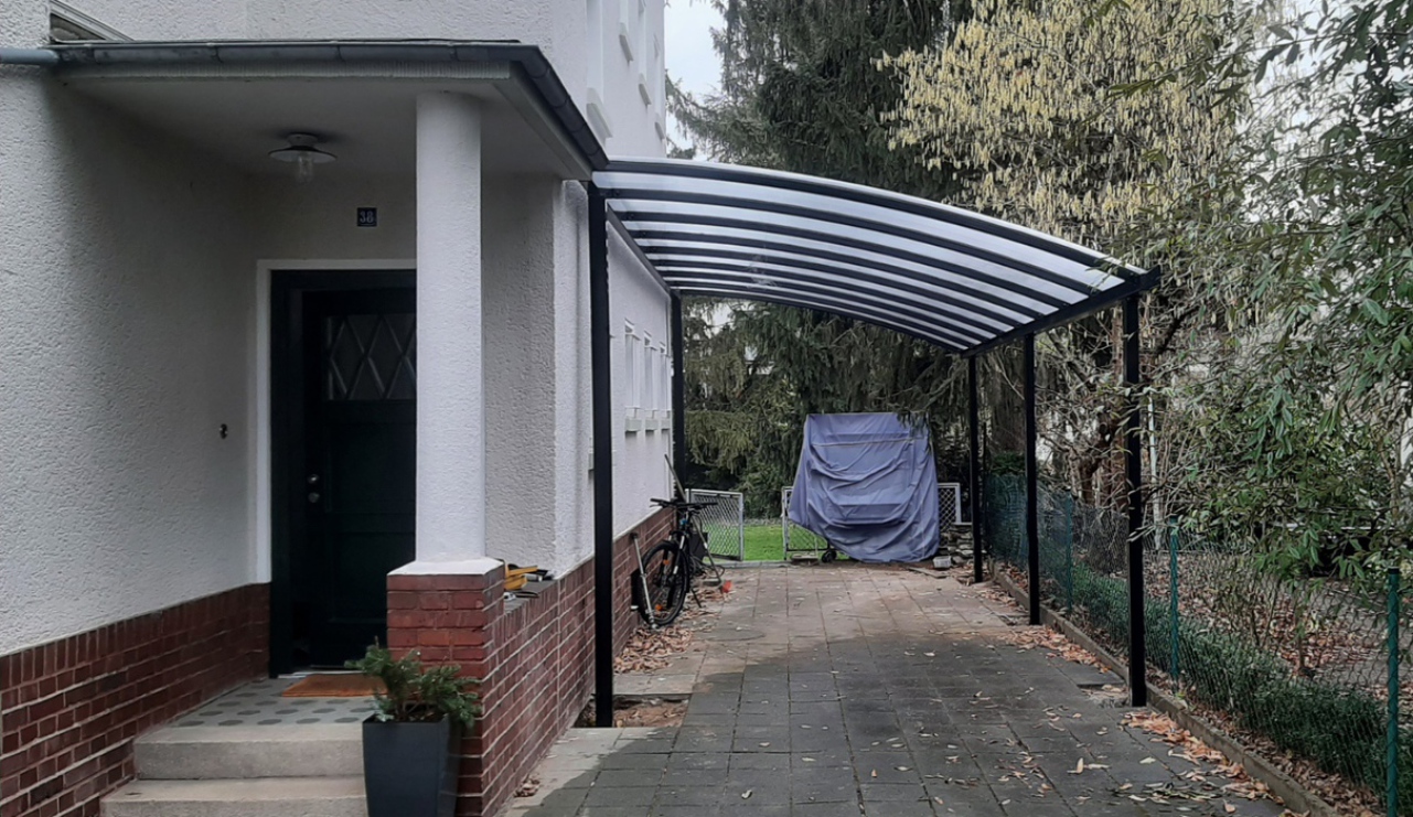 In enger Abstimmung mit der Kundin wurde die Neigung des Bogendachs anhand photorealistischer Visualisierungen angepasst, damit der moderne Carport sich möglichst harmonisch neben der Gründerzeit Villla einfügt.