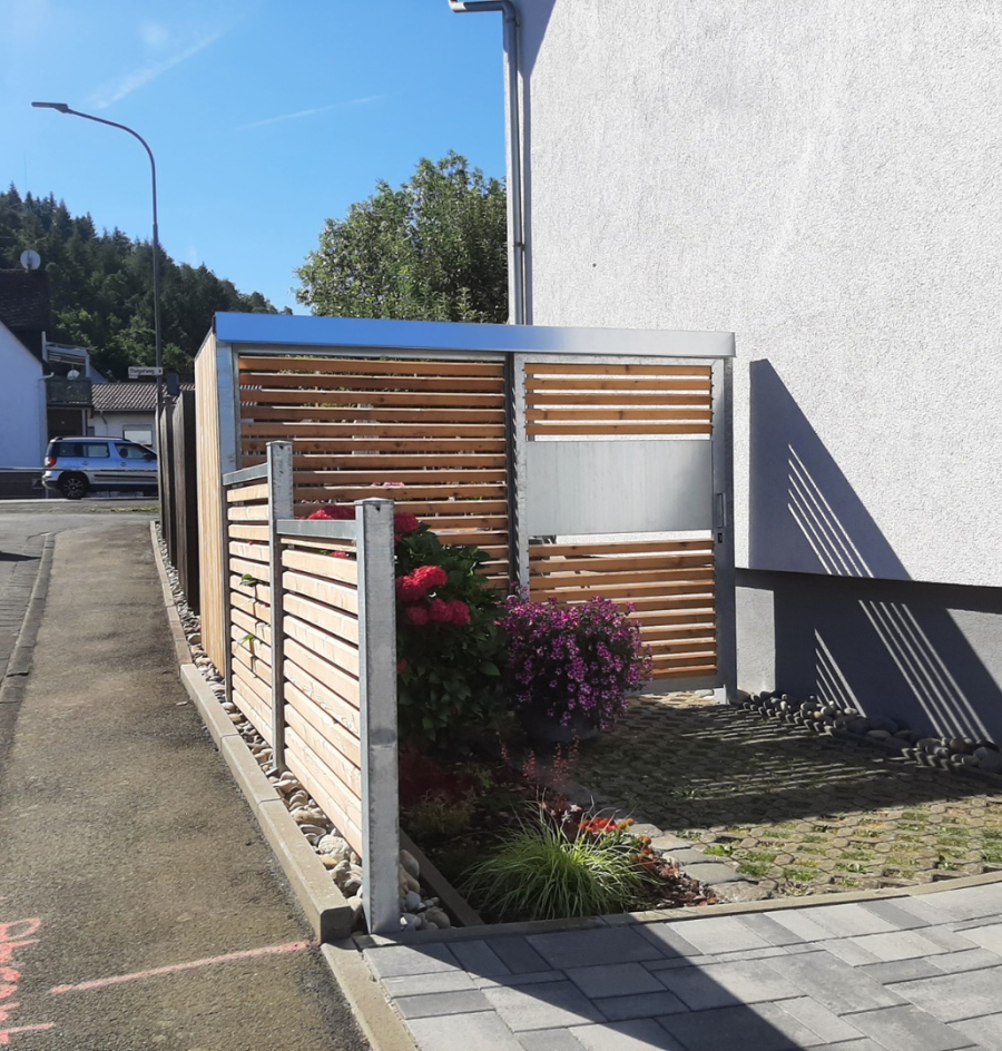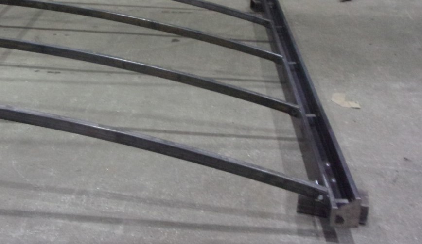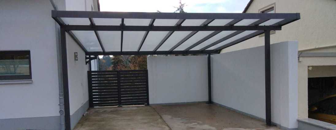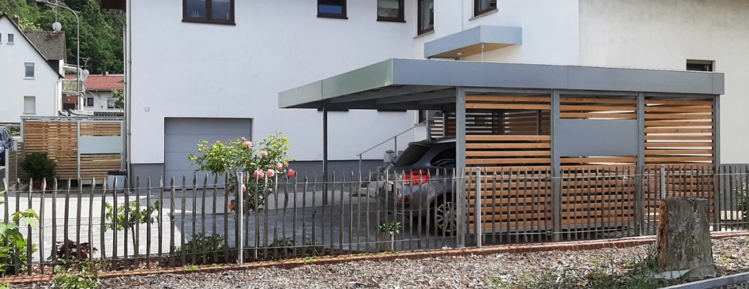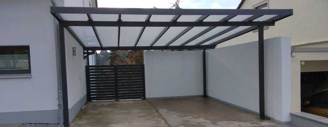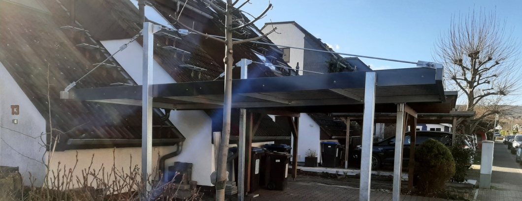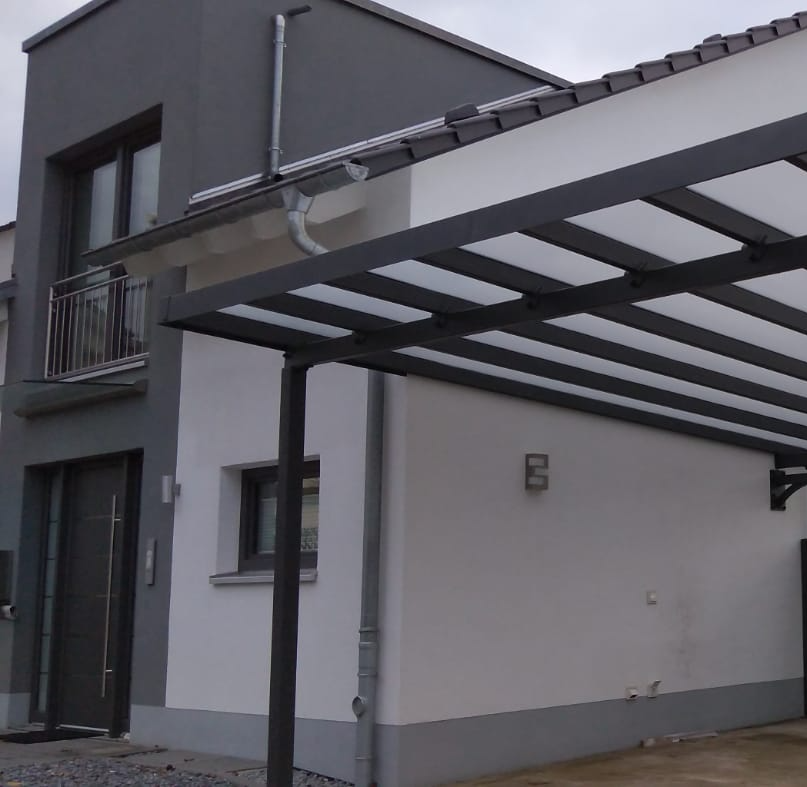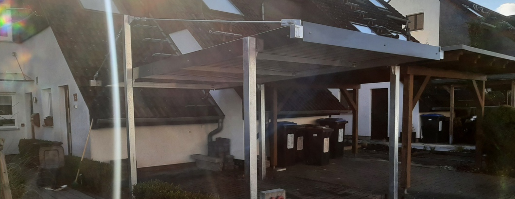 Nach der Feuerverzinkung wurde der Carport im Duplexverfahren mit besonders kratzfester Struktur pulverbeschichet. Im Photo unten rechts sehen Sie die integrierte Regenrinne im Rohzustand. Diese besondere Konstruktion erlaubt eine maximale Durchfahrtsbreite.