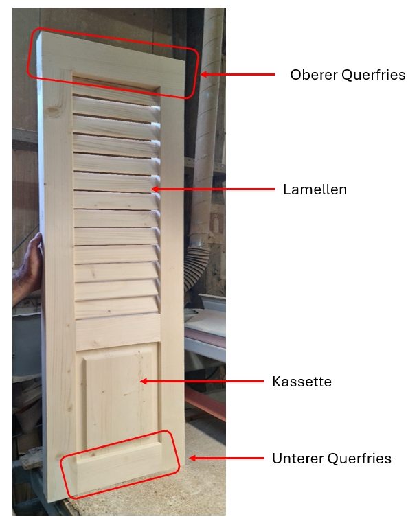 Die Rahmenkonstruktion kann gezapft oder gedübelt werden. Die Abmessungen der Friese beträgt mindestens 70 x 30 mm. Der obere Querfries geht durch, der untere Querfries liegt zwischen den senkrechten Friesen. Die empfohlene maximale Ladenbreite beträgt 65 cm ohne zusätzlichen senkrechten Fries, die Ladenhöhe ohne waagrechten Querfries bis 180 cm, mit Zwischenfries bis 240 cm.