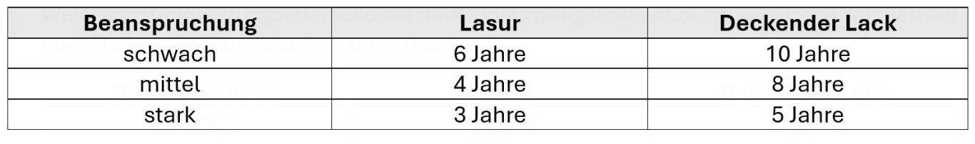 Folgende Instandsetzungsintervalle sind bei Nadelholz im allgemeinen zu erwarten: