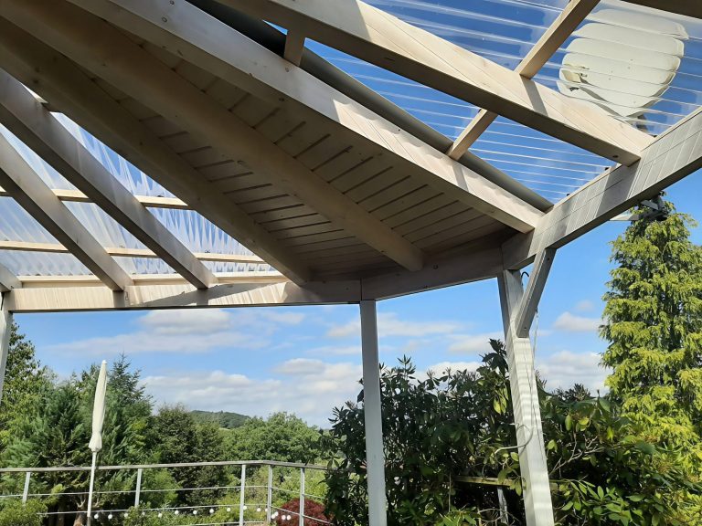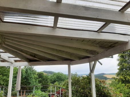 Wir haben neue Dachsparren angefertigt und die Auftraggeber haben diese in Eigenleistung ölbasiert gestrichen. Anschließend haben wir auch neue Wellplatten aus Polycarbonat eingebaut, und den lichtdurchlässigen Bereich vergrößert.