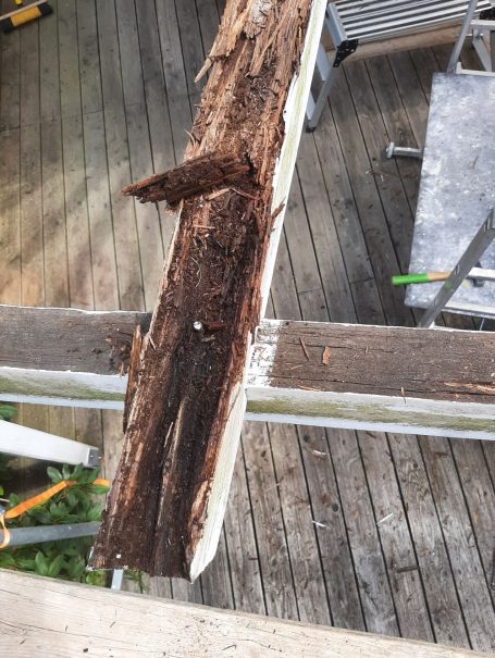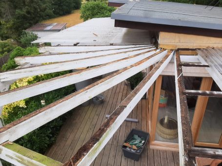 Im Laufe der Jahre hat dieser Wintergarten stark gelitten. Vermutlich durch die Kombination von Undichtigkeiten am Dach, Kondenswasser und wasserundurchlässiger Lackschichten waren einige Sparren durchgefault. Das wahre Ausmaß der Schäden war erst nach Demontage der Wellplatten erkennbar.