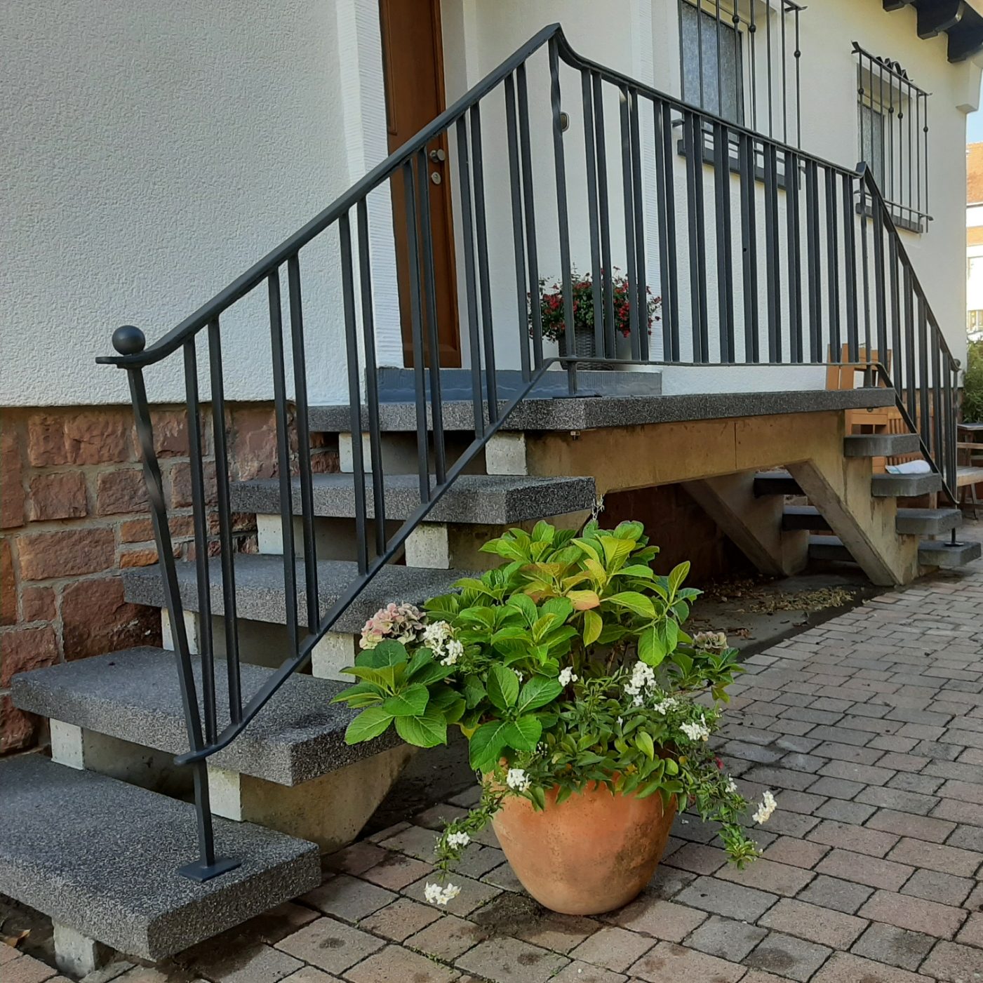 Aufgrund seiner massiven Bauweise war dieses Geländer sehr gut instand zu setzen. Wir haben es am Stück demontiert. Es wurde auch am Stück sandgestrahlt und pulverbeschichtet. Anschließend wurde es wieder an Ort und Stelle aufgebaut.